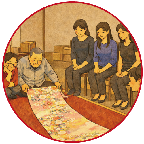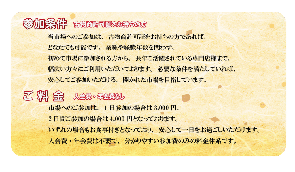 反物や帯を中心に、良質な品を手に取りやすい価格で揃える市場です。初心者の方から仕入れ目的のお客様まで、安心して参加できる、温かな雰囲気づくりを大切にしています。